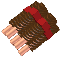 | Die sechseckigen Silikonspacer werden an einer definierten Stelle angebracht. Es gestattet, die einzelnen Rohre in einer 60° Teilung zu positionieren. Das Silikonmaterial absorbiert Vibrationen, ermöglicht eine starre Konstruktion der Bündel und die Vorpositionierung der Rohre zur Einführung in Rohrböden. |