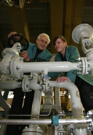 Boulos Alnajjar und Karolin Rüther von der Firma MAN Turbo AG kontrollieren die Ölversorgungsanlage, die sie vom Plauener Unternehmen Tubetech gekauft haben. Sie wird demnächst nach Ägypten verschifft.